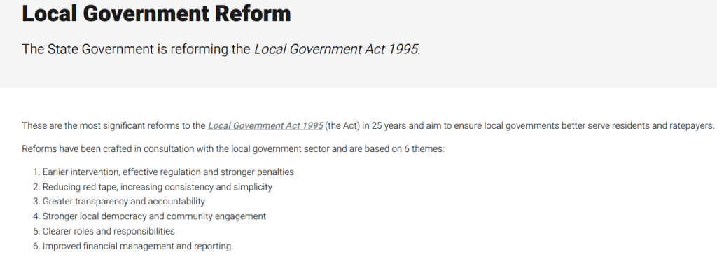 Please refer to the DLGSC pages posting more accurately about their latest reforms. https://www.dlgsc.wa.gov.au/local-government/local-government-reform